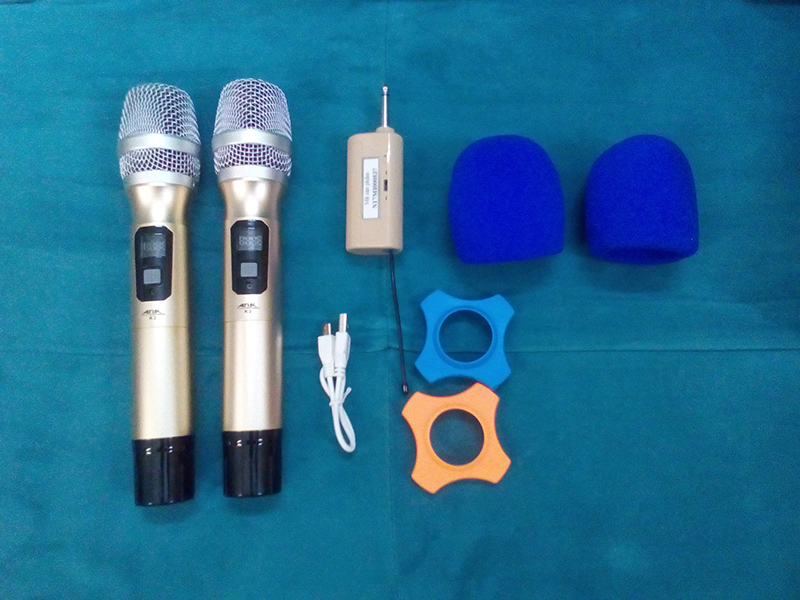 Phụ kiện : 2 micro , 1 dây sạc, 1 đầu thu có cổng kết nối 6.5 mm, 2 vòng chống lăn micro, 2 mũ chụp đầu micro.