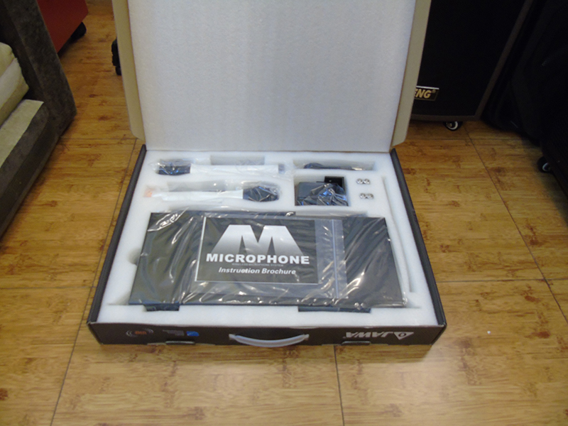 Bộ Micro Jawa GL-369 được thiết kế vô cùng đẹp mắt, sáng trọng, được đặt trong hộp đen có tay nắm như một chiếc Vali. Bên trong là bộ sản phẩm gồm có đầu thu, cục nguồn điện, bộ đôi Micro trắng đen, jack 6.5 và pin AA có sẵn để lắp vào Micro.