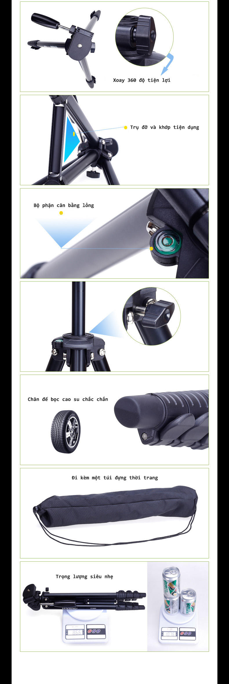 Với thiết kế bằng chất liệu hợp kim nhôm cao cấp cứng cáp và gọn nhẹ, một điểm tựa chắc chắn cho máy ảnh, không sợ bị rung, giúp bạn cho ra được những bức ảnh đẹp và vô cùng hài lòng.