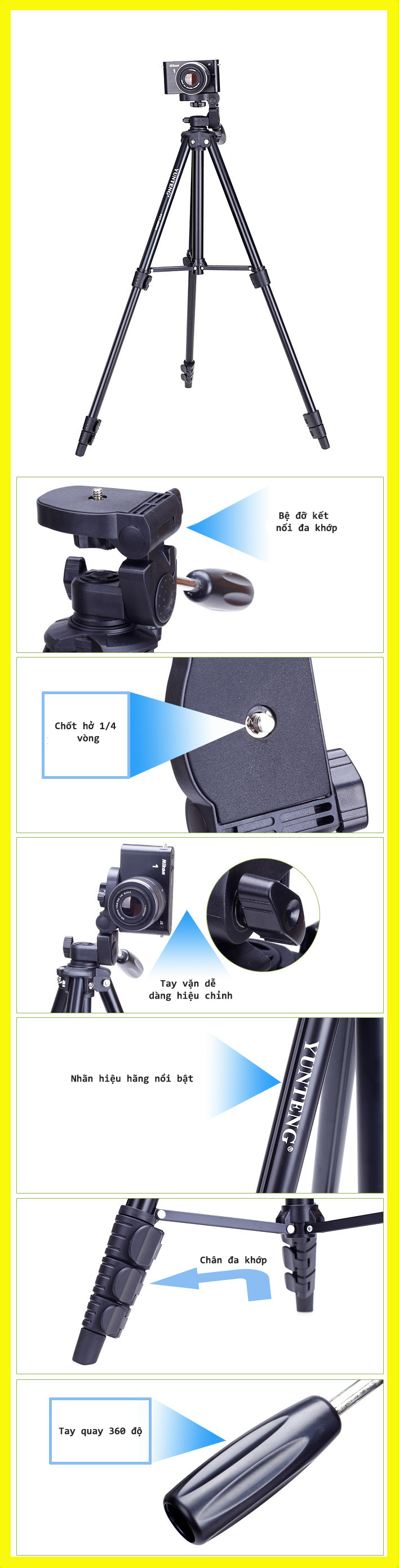Chiếc chân máy ảnh VCT-680RM được trang bị 3 chân có thể thu gọn lại với chiều cao tối thiểu là 38cm và tối đa là 145cm, với địa hình như thế nào đi nữa cũng có thể tùy chỉnh kích thước để phù hợp với góc chụp song có được một thế đứng vững chắc nhất. Cùng với thiết kế màu đen sang trọng hiện đại, thu gọn và tùy chỉnh dễ dàng chân tripod Yunteng VCT-680RM đã tạo nên được điểm mạnh của mình cho người tiêu dùng.