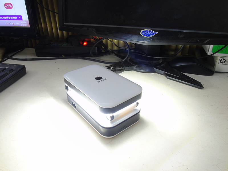 Đèn có hai chế độ sáng là On 1 và On 2, tương ứng với hai mức độ sáng khác nhau của đèn. Mặt đèn được trang bị 24 bóng đèn led trãi đều, lượng điện năng tiêu thụ rất nhỏ, công suất chiếu sáng tuy nhỏ nhưng cường độ sáng rất lớn, tuổi thọ đèn lâu hơn rất nhiều so với các loại đèn huỳnh quang, dây tóc.Ở mặt sau còn có một cổng sạc với nguồn điện từ 100 ~ 240V