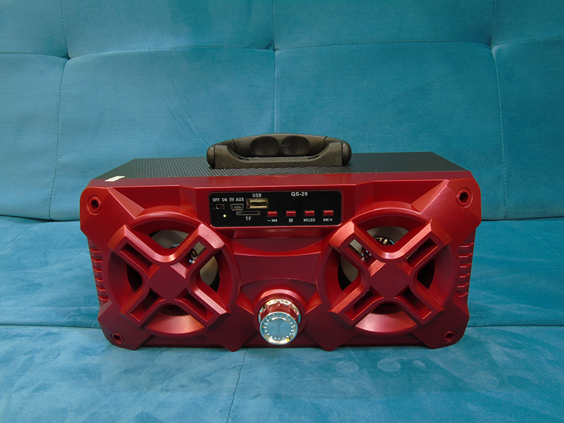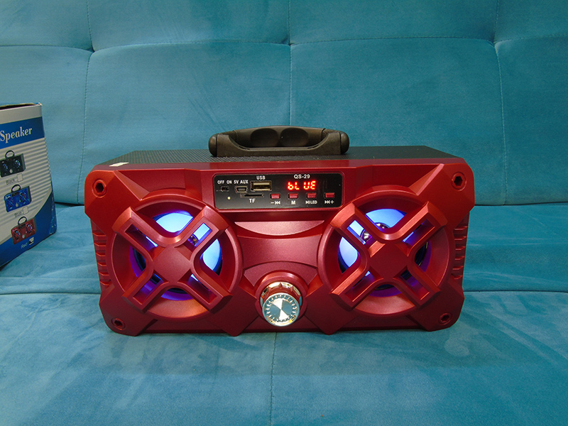 Thiết kế với chất liệu nhựa ABS chắc chắn và an toàn với người dùng tương tự với các dòng loa bluetooth QS khác, song QS-29 lại được thiết kế theo phương nằm ngang, thoạt nhìn ta có thể lầm tưởng như một chiếc radio. Loa được tiết chế không có màng loa để cho âm thanh thoát ra một cách trực tiếp mà không bị giảm chất lượng. Nếu bạn lo lắng như vậy loa bass sẽ không an toàn thì bạn đừng lo, QS-29 có thiết kế 1 miếng xốp mỏng bên trong là đèn led nhấp nháy theo nhạc, vừa bảo vệ đươc loa bass khỏi những va chạm vừa làm loa trở nên bắt mắt và cuốn hút trong các bữa tiệc.