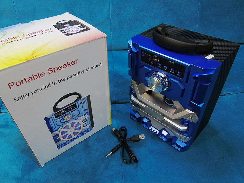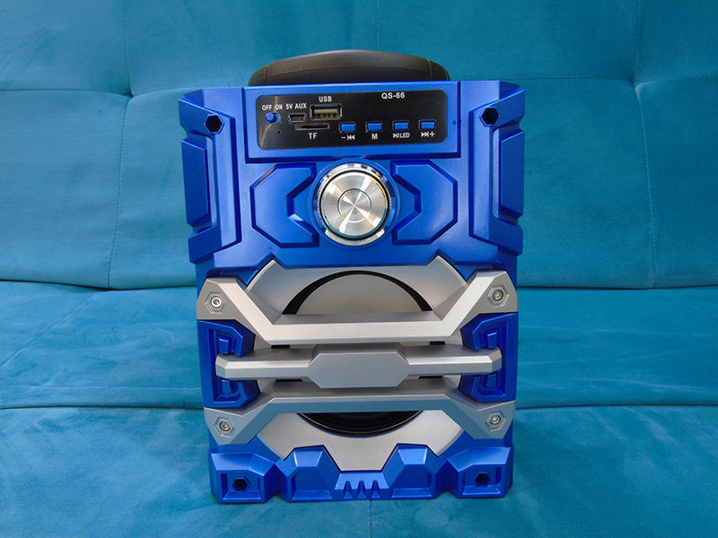 Loa bluetooth mini QS-66 có lớp vỏ ngoài cấu tạo từ chất liệu nhựa ABS cứng cáp, giúp giảm trọng luợng loa thuận tiện trong việc di chuyển hay mang theo các chuyến đi xa. Kích thước nhỏ gọn, loa thích hợp sử dụng trong môi trường nhỏ cũng như người dùng có thể sử dụng loa trang trí trong phòng hay bàn làm viêc. Mặt trước loa được thiết kế theo phong cách khối ghép, tạo nên nét trẻ trung, mạnh mẽ, cá tính. Loa được trang bị 1 bass 8 cm với âm thanh chắc ấm, phía trước loa bass là 3 thanh chắn ngang được thiết kế theo dạng khối viền cắt tạo điểm nhấn cho loa. Ẩn sau 3 thanh chắn là 1 đèn led chớp tắt thay đổi màu theo bản nhạc được phát trên loa. Phía trên loa bass là một phím vặn điều chỉnh Volume của loa người dùng có thể chỉnh theo ý thích.
