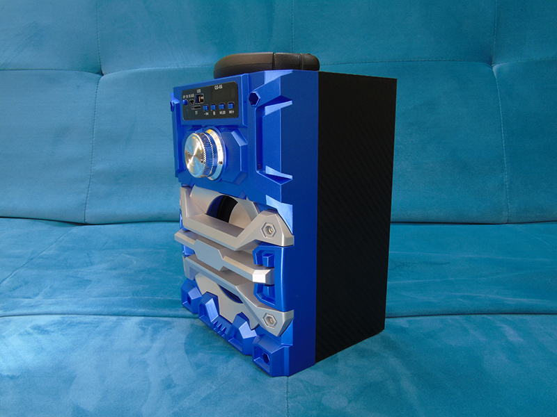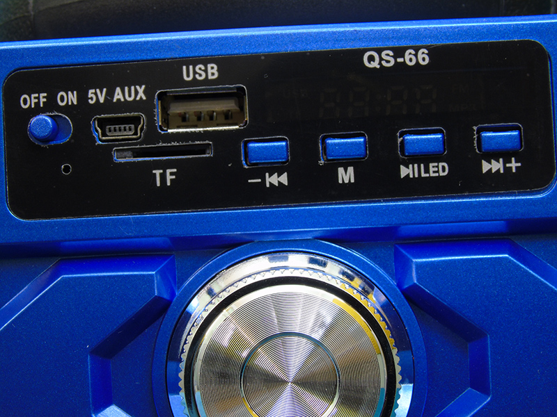 Bảng mạch điều khiển phân bố ở mặt trước của loa, với một công tắc chính ON/OFF dùng để tắt mở loa rất thuận tiện. Bên cạnh là cổng miniUSB sử dụng để sạc pin loa với nguồn điện vào là DC 5V cũng như kết nối với các thiết bị khác. Kế đó là 2 cổng thẻ nhớ TF và cổng USB người dùng có thể sử dụng thẻ nhớ hay cáp đi kèm loa để nối các thiết bị khác phát nhạc trực tiếp trên loa. Nằm bên trên góc phải là một mà hình led nhỏ thông báo chế được mở trên loa trợ giúp người dùng thuận tiện theo dõi. Phía dưới là 4 phím điều khiển thường gặp dùng để điều chỉnh bài hát như tới, lui, tạm dừng, tăng giảm âm lượng, chuyển đổi chế độ.