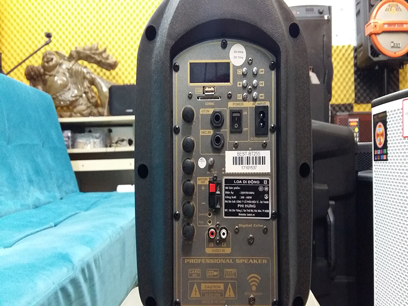 Ngay bên dưới là bộ điều chỉnh âm thanh của micro và loa, cổng kết nối micro có dây ( 6.5mm ) cổng AUX ( 3.5mm),cổng sạc , cổng kết nối 12V và nút nguồn. Ngoài ra loa Best BT-255 còn có khả năng kết nối Bluetooth, khi đó bạn có thể nghe những bản nhạc của mình mọi lúc mọi nơi.
