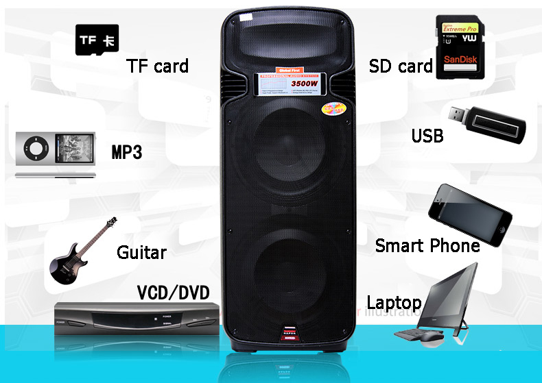 A65 Kết nối hầu hết với các chuẩn card lưu trữ hiện nay như TF-Card, SD-Card, USB, Mp3, Laptop, Đầu DVD/VCD, Guitar…