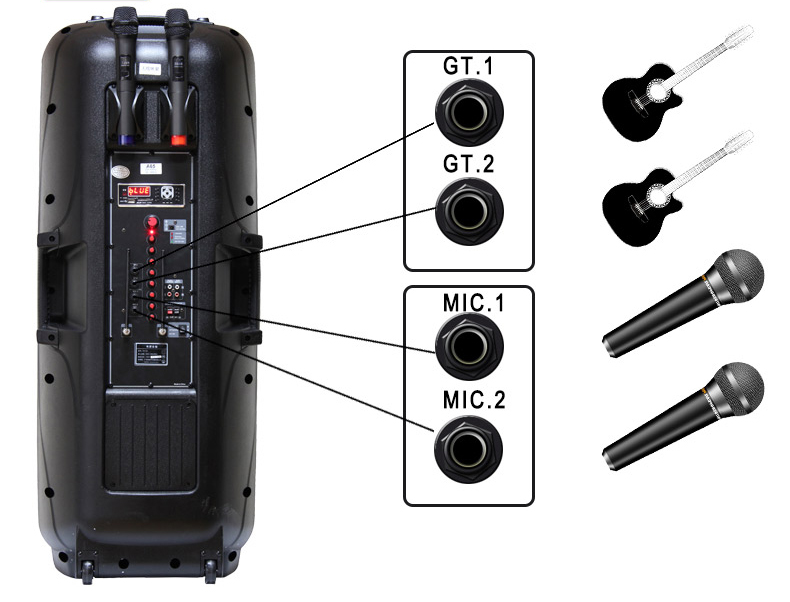 TEMEISHENG A65 trang bị cho ngươi dùng 2 cổng cắm mic và 2 cổng cắm guitar 6.5mm