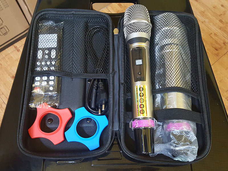 Phụ kiện : 2 micro không dây, 1 dây sạc, 1 remote