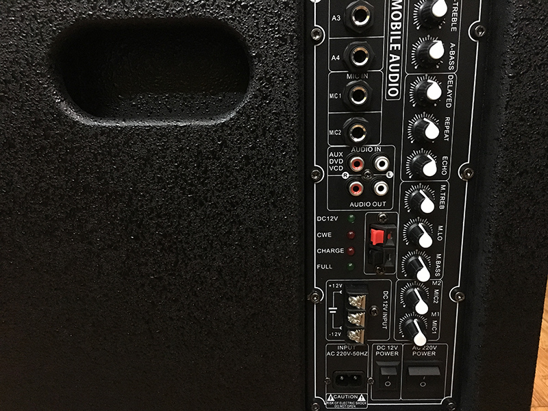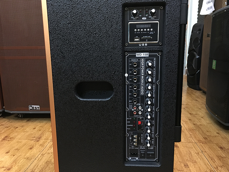 - Bốn đèn báo tình trạnh bình, 2 cổng đấu bình acquy 12 V, một cổng sạc, công tắc sữ dụng bình và công tắc sử dụng acquy, tất cả được tích hợp rất gọn gàng ở phần dưới của loa.