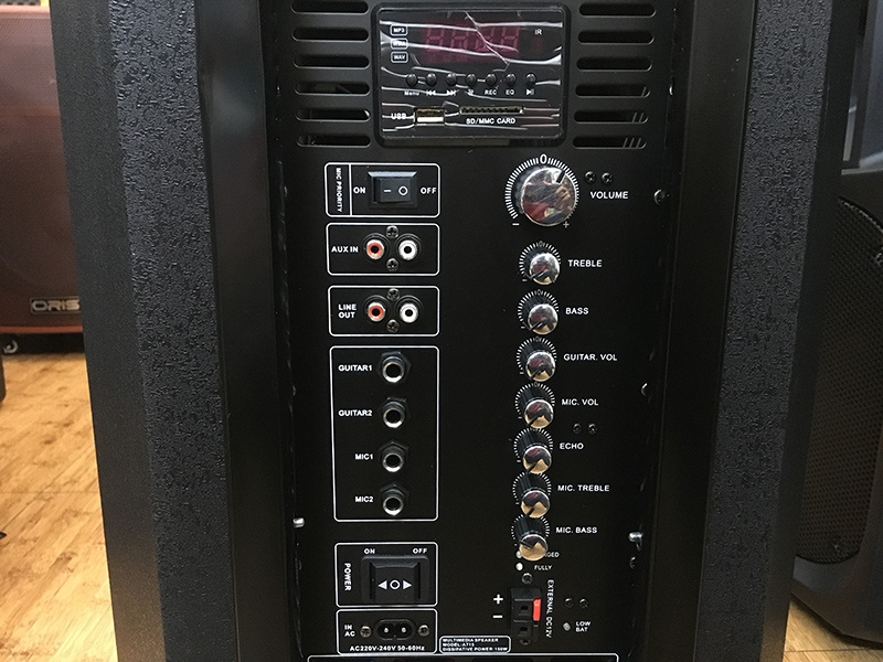 + Bên trái là các cổng kết nối có dây ( như cổng AUX IN, LINE OUT, GUITAR 1-2, MIC 1-2 và cổng sạc với nguồn điện 220V )