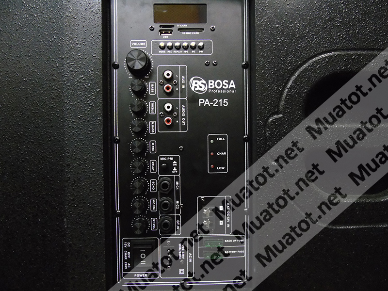 Tuy nhiên, với nhiều cổng kết nối như vậy thì yêu cầu phải có một bảng điều chỉnh với đầy đủ các tính năng để có thể tinh chỉnh loa một cách chính xác nhất. Bosa hoàn toàn không làm chúng ta thất vọng khi đưa ra một bản điều chỉnh rất gọn gàng, dễ hiểu nhưng vẫn đảm bảo khả năng tùy chỉnh cao cho loa. Bảng điều chỉnh bao gồm một màn hình led cùng hệ thống nút thay đổi kênh, chế độ sử dụng; hệ thống tùy chỉnh âm lượng nhạc và micro thông qua các nút xoay dành riêng cho âm lượng của bass, treble, mic.bass, mic.treble, echo, delay...; hệ thống kết nối âm thanh ngoài thông qua các ngõ Aux in, audio out...; hệ thống sạc gồm 3 chế độ là dùng điện bình, sử dụng điện trực tiếp và sạc(lưu ý là bạn nên hạn chế việc vừa sử dụng loa vừa sạc khi để công tắc ở chế độ dùng điện bình, điều này sẽ gây nguy hại chi chất lượng của bình điện về lâu dài).