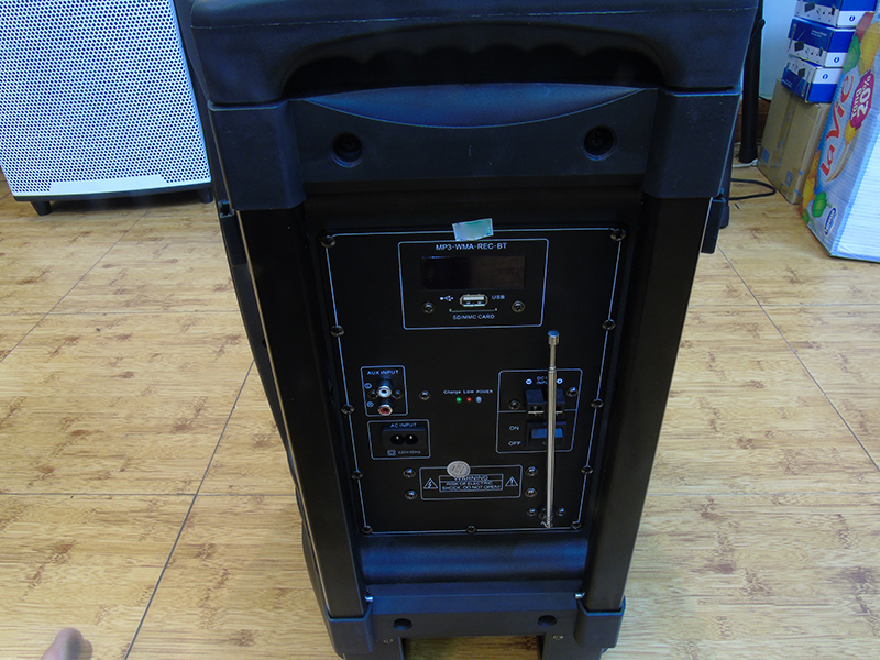 Bên góc phải bản mạch là 1 cổng sạc phụ sử dụng nguồn điện từ pin acquy 12v giúp bạn cả thiện thời lượng sử dụng loa không còn phải lo lắng cuộc vui bị ngắt quãng. Nằm ở phía dưới là công tắc chính bật tắt loa được bố trí rất thích hợp giúp bạn thuận tiện thao tác. Loa còn hỗ trợ thêm người dùng một angten dùng thể thu tín hiệu, tần số.