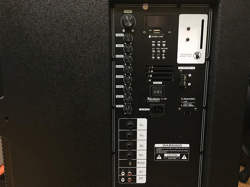 Ở phần trên ở mặt sau của loa, ta có thể thấy một bảng đèn led, cho phép người dùng theo dõi mọi hoạt động của loa, kèm theo đó là các nút chỉnh xung quang khi dùng ở chế độ USB, nút chỉnh mode và cổng USB, SD.