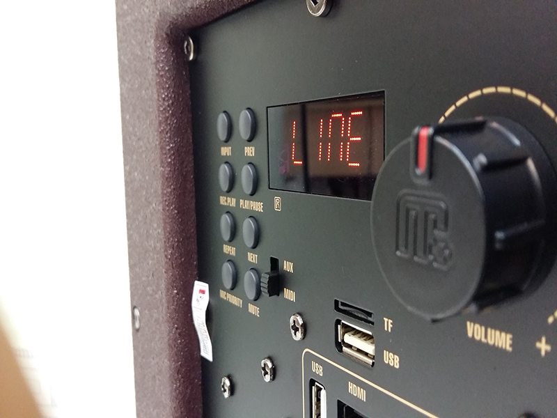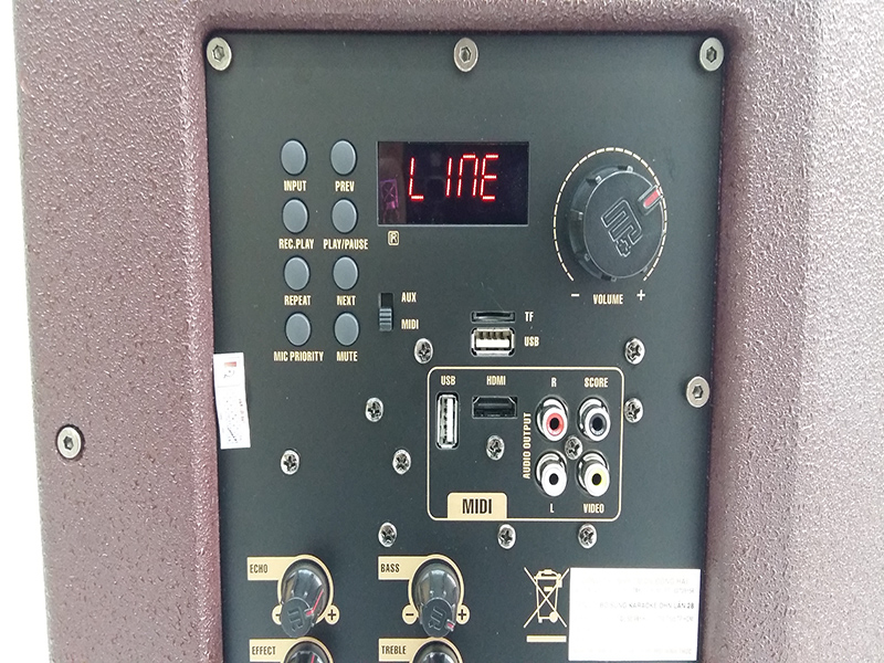 Hàng trên cùng ta có một bảng đèn le, các nút điều chỉnh khi dùng USB/ chuyển chế độ và nút chỉnh âm lượng của loa. Ngay bên dưới là các cổng kết nối cơ bản gồm : USB/SD, USB karaoke, AUX và Video khiến việc kết nối với hầu hết các thiết bị khác bằng dây trở nên dễ dàng nhất.