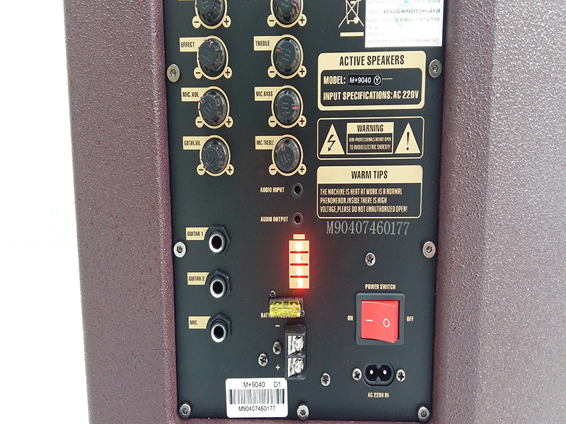 Phần giữa của bảng mạch là các cổng điều chỉnh âm thanh của micro/ loa, cổng Audio Input, Audio Output, cổng 6.5 cho micro có dây và guitar. Phía dưới cùng là cổng kết nối acquy 12V, cổng đấu bình 220V và đèn báo sạc pin.