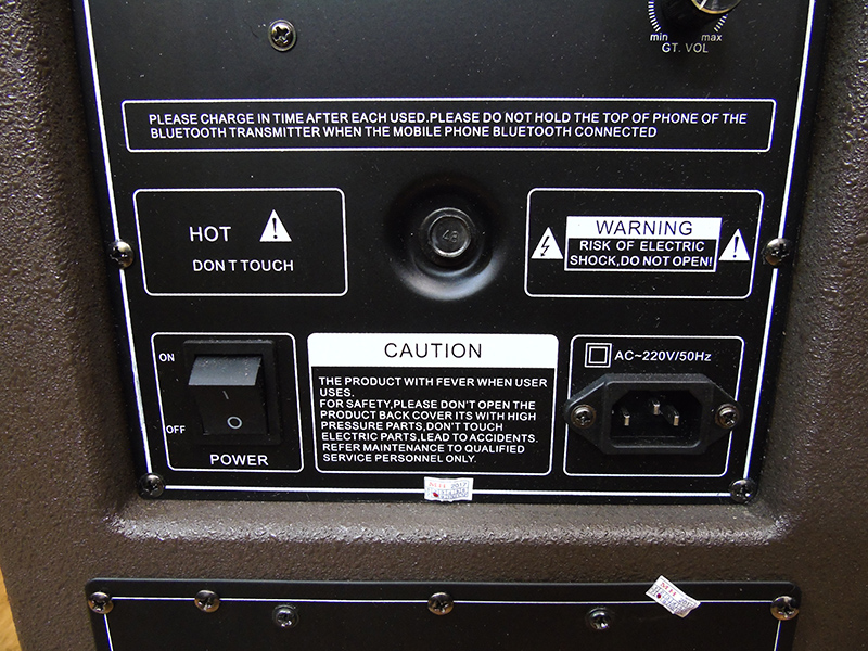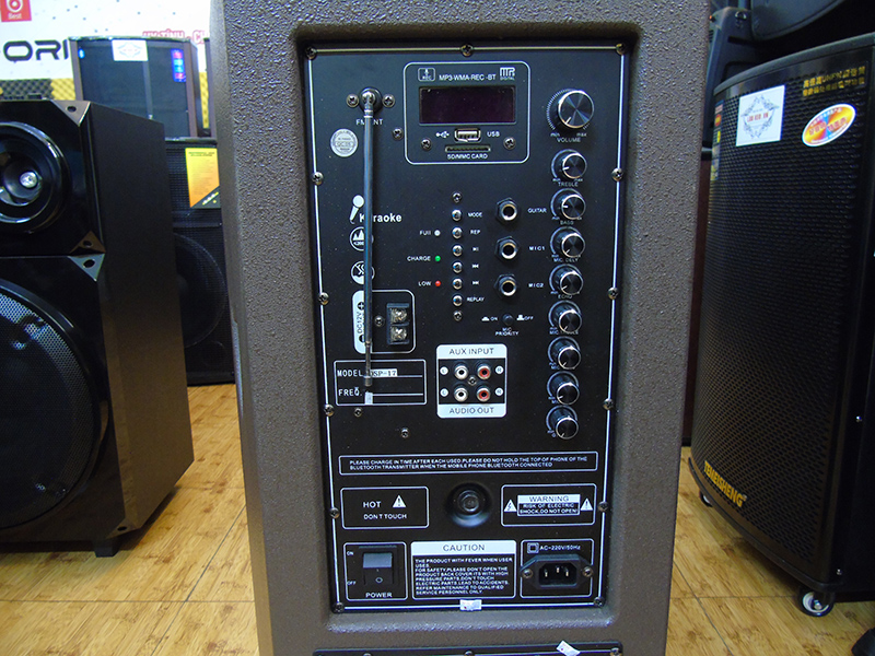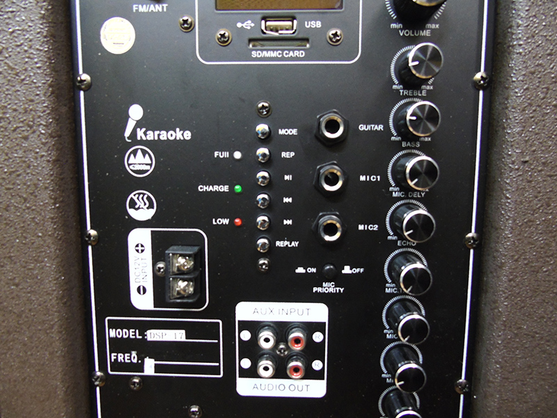 Ngoài bìa góc trái là một hàng nút dài dùng để chỉnh âm thanh của loa và âm thanh của micro. Ngay bên cạnh là các cổng kết nối 6.5 và 3.5 cho các kết nối có dây. Phần dưới cùng gồm một cổng kết nối sạc với nguồn 220V và nút công tắt.