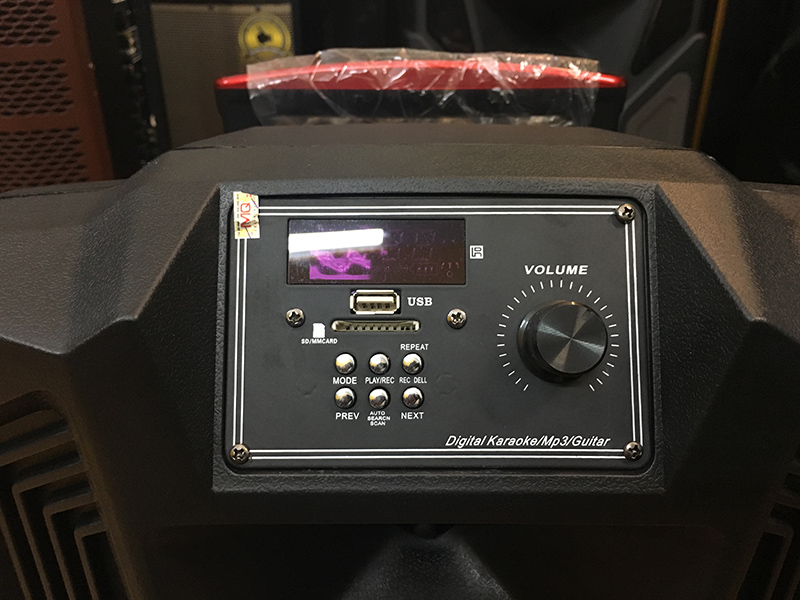 Dưới cùng là bộ phím bấm điều chỉnh chế độ khi dùng USB/SD. Góc phải bảng điều khiển là một phím vặn dùng để điều chỉnh âm lượng của loa người dùng có thể điều chỉnh tùy ý.