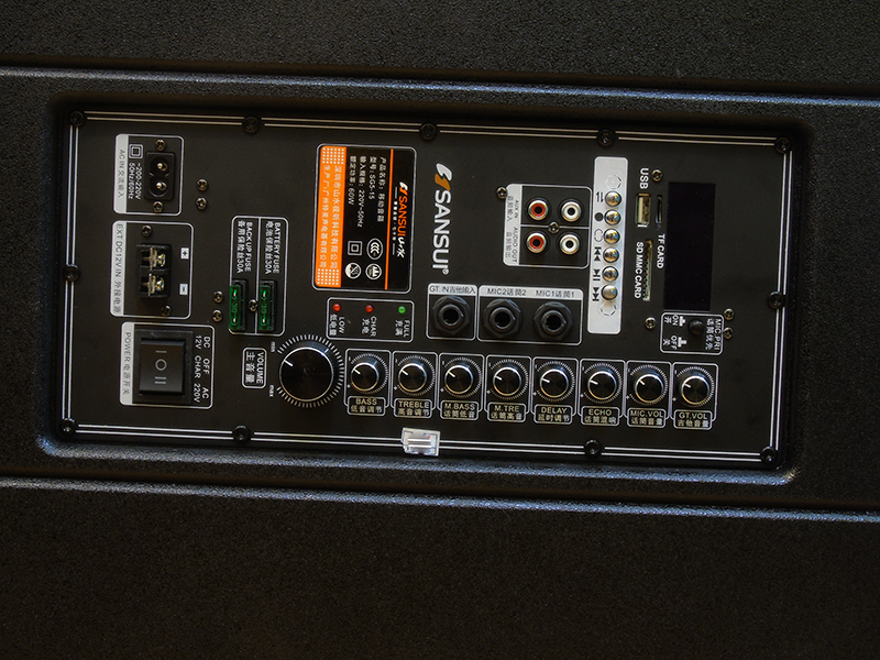 Bảng điều khiển của loa cũng được thiết kế rất gọn ở mặt bên của loa với kết cấu khá đơn giản, thân thiện cho người dùng. Các nút điều chỉnh bass, treble, micro vol, music vol đều là dạng nút xoay,có phép người dùng dễ dàng thao tác, điều chỉnh mức độ âm thanh cho phù hợp nhất với nhu cầu, mục đích sử dụng. Loa cũng được trang bị đầy đủ các cổng kết nối bluetooth, usb, thẻ nhớ SD giúp người dùng tha hồ tận hưởng mọi thể loại âm nhạc ở bất cứ đâu. Giờ đây, chỉ với một chiếc loa di động duy nhất và một thiết bị điện thoại thông minh là bạn đã có thể tha hồ hát karaoke cùng bạn bè cũng như lắng nghe và thể hiện những bản nhạc độc đáo của riêng bạn.