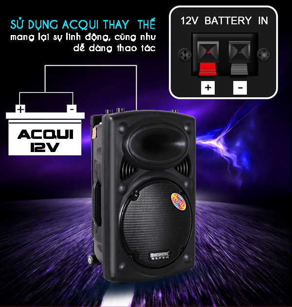 Loa Temeisheng 297L có thể linh động sử dụng nguồn điện thay thế bên ngoài khi hết pin đó là acqui 12V. Điều này sẽ giúp bạn không cồn lo lắng về nguồn cung cấp điện khi đi chơi xa.
