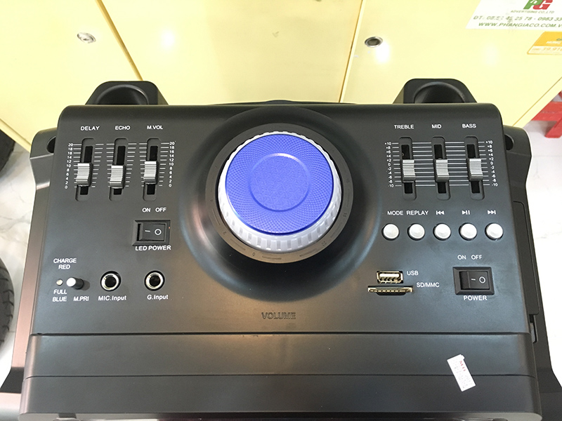- Mặt trên ở hàng trên cùng gồm các nút chỉnh như Delay, Echo, Micro Vol của micro và Treble, Bass , Mid cho loa. Chính giữa trung tâm còn có một nút chỉnh Volume lớn, các phím chỉnh khi dùng USB/SD và công tắc đèn Led ( công tắc đèn led cũng là công tắc bật màn hình cảm ứng của loa )