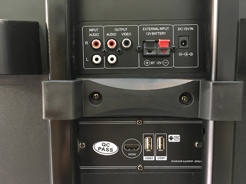 - Mặt sau của loa gồm các cổng kết nối cơ bản như : cổng kết nối IN/OUT Audio, Video, HDMI, USB và cổng sạc với bình acquy 15V